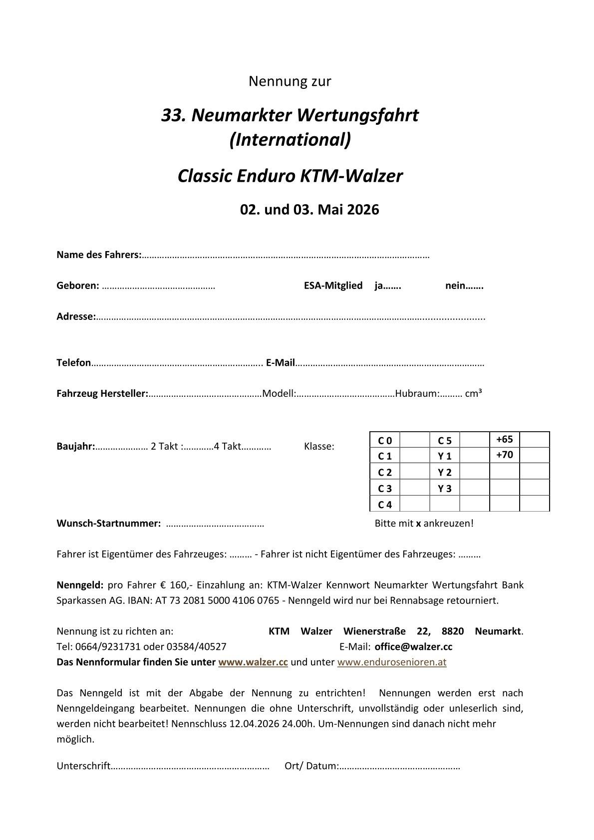 Für die 33. Int. Neumarkter Wertungsfahrt als Klassik Enduro Veranstaltung am 2. und 3.5.2026 in Neumarkt, OT See (Österreich) gibt es jetzt ganz aktuell die Ausschreibung sowie die Nennungsunterlagen.