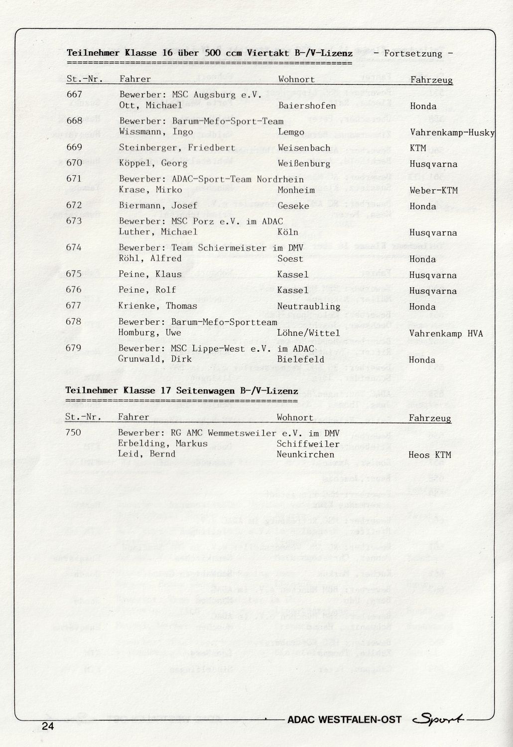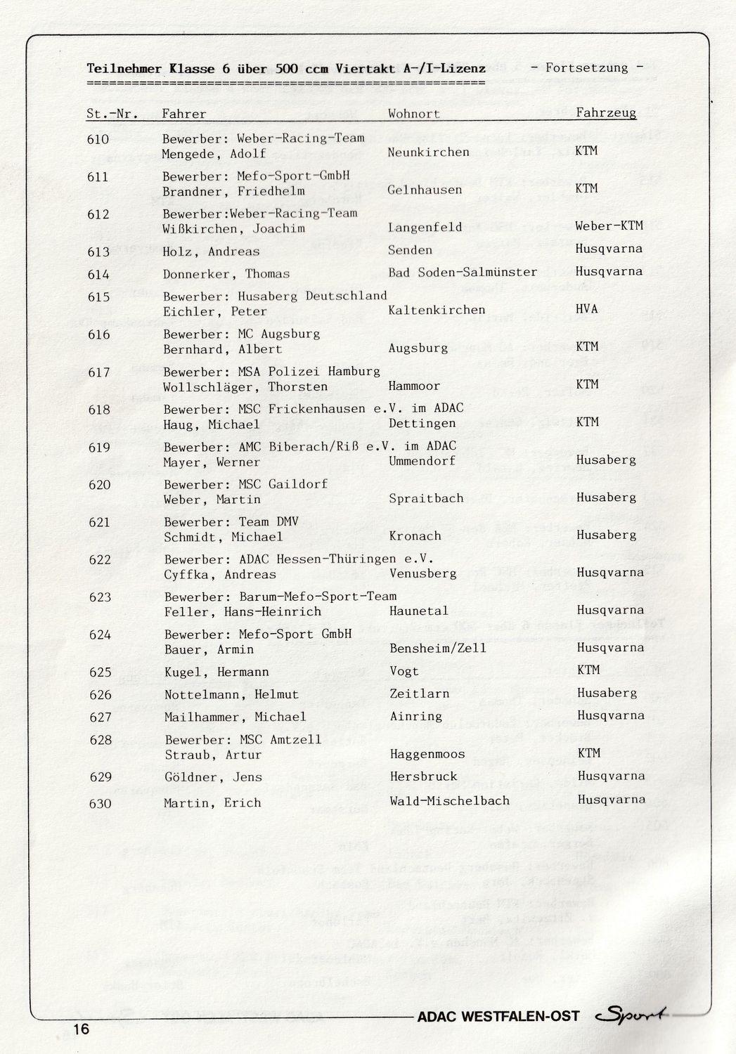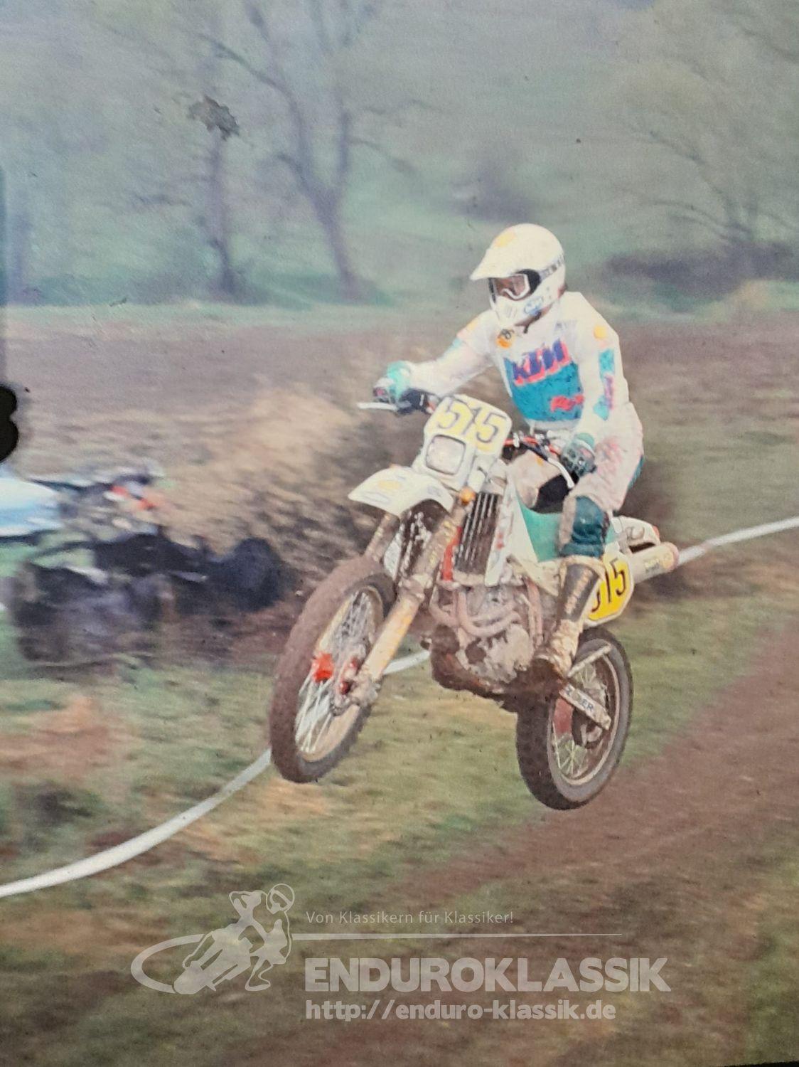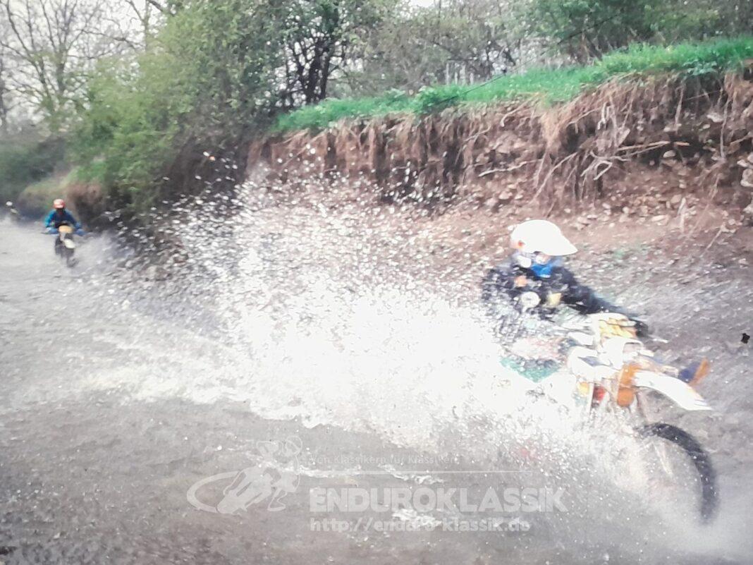 Denn die ursprüngliche Planung, diese Prädikatsgeländefahrt wie üblich auf dem militärischen Gelände in Augustdorf bei Bielefeld durchzuführen, ließ sich kurzfristig aus „im weitesten Sinne genehmigungstechnischen Gründen“, nicht realisieren. Dies hatte zur Folge, dass der umtriebige ADAC Motorradreferent Wolfgang Butzner und sein Team ihre weitläufigen Motorsportkontakte nutzten und dabei auch in Kontakt zu Konrad Bezold, dem damaligen Vorstand der MSC Ohrdruf vom Gau ADAC Hessen-Thüringen kamen. Und für Konrad Bezold und seine Vereinskollegen war das eigentlich kein Thema. Der MSC Ohrdruf machte das unmögliche möglich. Eine mehr als anspruchsvolle Strecke „Rund um Ohrdruf“ konnte zügig gefunden und genehmigt werden und so stand der zeitgerechten Durchführung der 50. Westfalen-Lippe-Fahrt nichts mehr im Weg. Das erste Kuriosum, sie fand zu ihrem Jubiläum nur einfach nicht in der Region Westfalen-Lippe statt. Doch was noch viel kurioser war. Statt auf einem deutschen Bundeswehrgelände samt angegliedertem Truppenübungsplatz, wurde die Veranstaltung nun auf einem russischen Militärareal samt russischem Übungsplatz und unter der Verantwortung eines russischen Standortkommandanten durchgeführt. Und als Parc ferme diente die zugehörige Panzerhalle. Trotz all dieser Widrigkeiten im Vorfeld, die Veranstaltung glänzte mit einem prallgefüllten Teilnehmerfeld und es wurde toller Endurosport geboten. Die Teilnehmer wurden nämlich nicht auf eine Notgeländestrecke geschickt, sondern sie bekamen eine Streckenführung geboten, die einem DEM Lauf sehr angemessen war und als absolutes Highlight eine 800 Meter lange Bachdurchfahrt aufwies. Ein echtes Novum. Es ist auch heute noch kaum vorstellbar, dass so ein cooler Streckenabschnitt bei einer Genehmigungsbehörde in einem der alten Bundesländer realisierbar gewesen wäre. Da haben der Konny und sein Team vom MSC Ohrdruf damals einen richtig tollen Job gemacht. Dass diese Geländefahrt am 11.5.1991 dann aber auch noch einen ganz besonders schwierigen Verlauf nahm, lag dann zusätzlich noch am Wetter. Morgendlicher dichter Nebel führte dazu, dass 4 Fahrer der 80er Klasse und drei Fahrer der 125er Klasse, die Pfadfinder sozusagen, grüne Streckenpfeile übersahen und versehentlich einer Gespannumleitung folgten. Das Übel bemerkten sie erst, als ihnen plötzlich 2 DK Stempel fehlten. Und so kam was kommen musste, die Meisterschaftsaspiranten Thomas Bieberbach als Lokalmatador und Frank Will, sowie die weiteren unglücklichen Falschfahrer, wurden disqualifiziert und mussten somit mögliche Meisterschaftsambitionen begraben. Mehrere Wolkenbrüche sorgten zudem für schwierigste Bodenverhältnisse, auch auf dem Sonderprüfungsareal, so dass sich an diesem Tag die Spreu vom Weizen trennte, wenn es um die Platzierungen in den einzelnen Klassen ging. Den Tages Gesamtsieg fochten Dirk von Zitzewitz und Uwe Weber, die auch gemeinsam an der Startlinie standen, unter sich aus, wobei sich DvZ auf der Suzuki am Ende des Tages durchsetzen konnte und vor KTM Fahrer Uwe Weber lag. Dies am Ende somit die sportliche West-Ost Komponente der Veranstaltung.