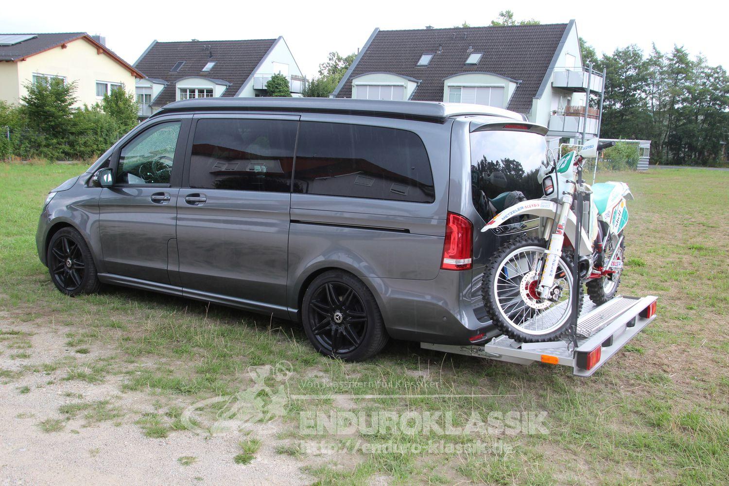In einem früheren Artikel (August 2024) konnten wir den Träger ja bereits an einem Fiat Ducato vorstellen. Aktuell hat sich nun für uns die Gelegenheit ergeben, die Fiedler Plattform auch an einem Mercedes Vito zu testen. Und auch an diesem Fahrzeug macht der silber eloxierte Träger (ist gegen Aufpreis auch schwarz pulverbeschichtet erhältlich) optisch eine ausgezeichnete Figur. Zudem besticht die komplett aus Alu gefertigte einzuschiebende Plattform (hier 0,56 m x 1,90 m) durch ihr geringes Gewicht von ca. 30 Kilogramm. Für den Vito, mit dem niedrigeren Fahrwerk gegenüber einem Ducato, wird der Träger in gekröpfter Form angeboten, so dass die Plattform leicht erhöht montiert ist und auch am Hang oder bei Serpentinen eine gute Bodenfreiheit gewährleistet wird. Am Fahrzeug selbst werden nur zwei verzinkte Halterohre montiert, in welche das Tragegerüst von einer Person alleine eingeschoben werden kann. Die Elektrik einer Anhängekupplung kann für die fertig vorgerüstete Heckbeleuchtung des Trägers genutzt werden und mittels zweier Schnellspannverschlüsse wird der Träger dann noch sicher fixiert. Der An- und Abbau lässt sich so in kürzester Zeit und völlig ohne Werkzeug sicher vollziehen. Das Fiedler Trägersystem kommt zudem völlig ohne eine zusätzliche Haltestange aus. Mit der mitgelieferten 140 cm langen Auffahrrampe lassen sich ein Motorrad oder ein Roller problemlos auf die Plattform schieben. Das Vorderrad steht sicher in einer kleinen Aluschale, welche exakt passend zum verladenen Bike individuell montiert werden kann. Das zu transportierende Fahrzeug kann nun mit handelsüblichen Spanngurten sicher an den vorhandenen 6 stabilen Haltebügeln fixiert werden. Die Alu-Auffahrrampe wird anschließend noch platzsparend auf der Plattform eingehängt und mittels Flügelschraube sicher befestigt. Schon kann die Fahrt beginnen.