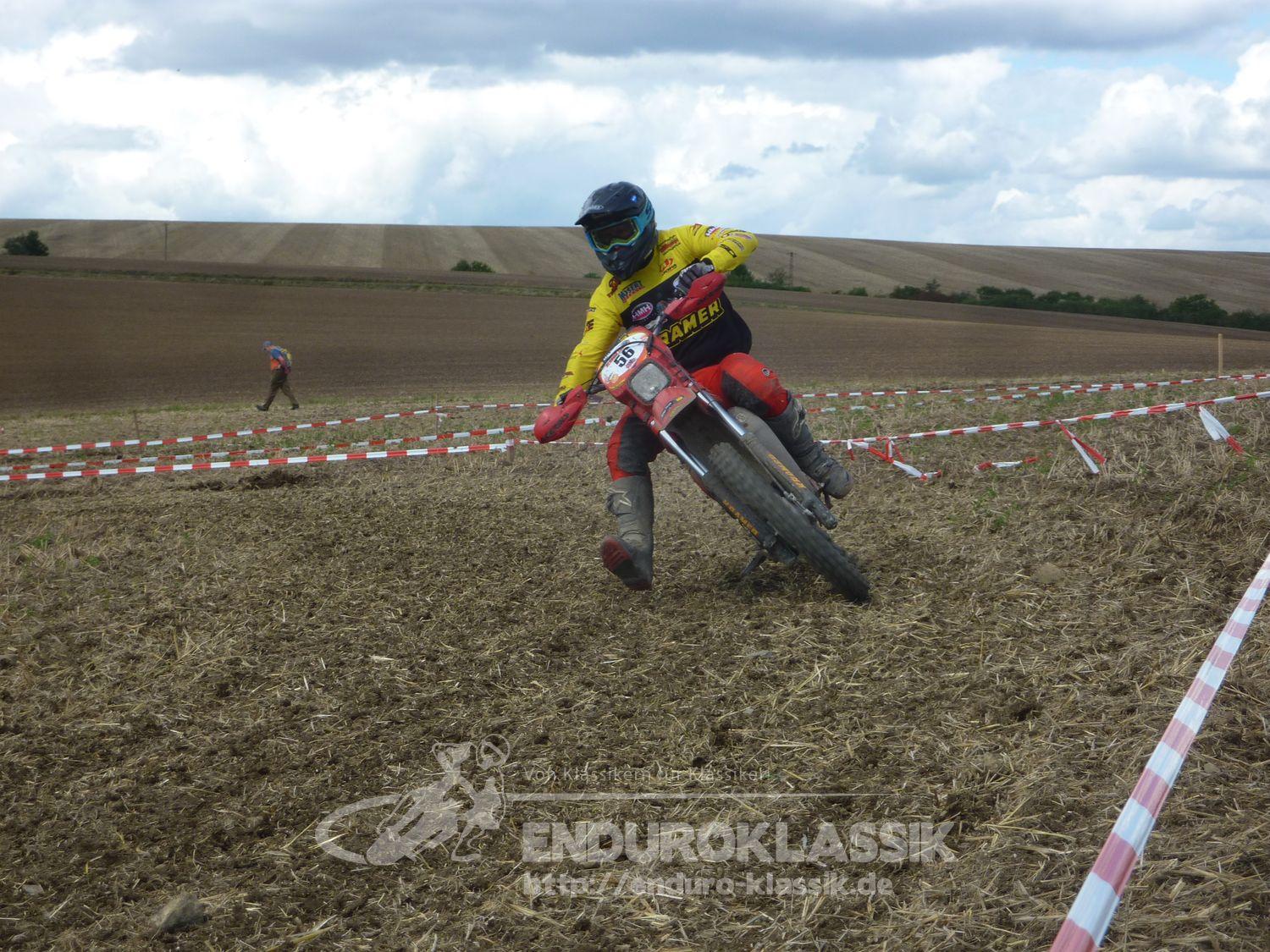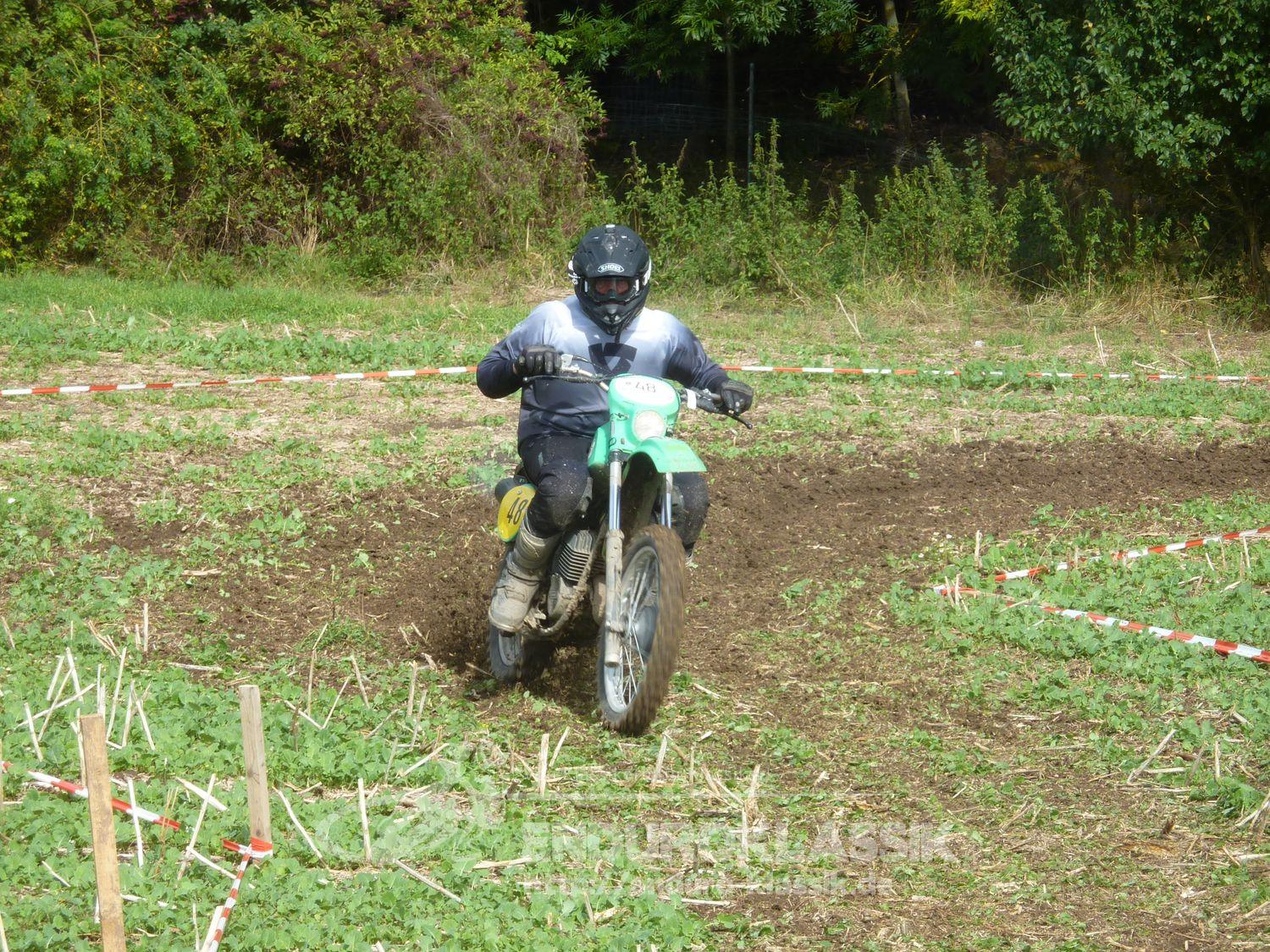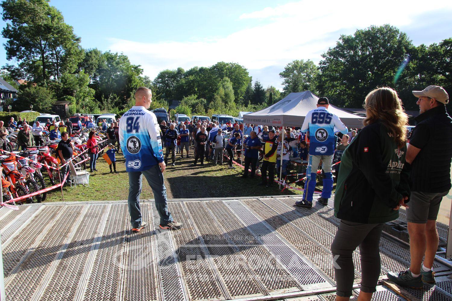 Für die 20. Jubiläums-Classic Geländefahrt im Weimarer-Land hat sich der Offroadclub Weimarer-Land einige Überraschungen und ein tolles Rahmenprogramm einfallen lassen. Neben vielen Ehrungen und einem musikalischen Festprogramm, betraf das auch die ca. 35 Kilometer lange Streckenführung rund um Niederroßla, welche diesmal in entgegengesetzter Richtung dreimal zu absolvieren war. Neben vielen Wegen über die Höhenzüge der Region mit tollem Weitblick gab es erneut eine große Anzahl an anspruchsvollen Waldpassagen und viele enge Trails mit mitunter knackigen Auf- und Abfahrten. Durch eine großzügige Ausschilderung mit angebotenen Umfahrungsmöglichkeiten schwieriger Passagen konnte sich jeder der ca. 180 Teilnehmer den Schwierigkeitsgrad der Geländestrecke seinem eigenen Leistungsvermögen, oder dem seines Motorrades, persönlich anpassen. Das kam bei sehr vielen Teilnehmern richtig gut an. Die Rundenfahrzeit war ausreichend gewählt und hätte sicher auch für einen Regentag gepasst. Doch den gab es nicht, auch wenn es am Freitag nach den örtlichen Regenfällen in der Flur noch nicht so toll ausgesehen hat. Das Wetter am Veranstaltungstag passte perfekt und die Wege sowie die beiden Ackersonderprüfungen trockneten rasch ab und spätestens nach der noch leicht rutschigen ersten Runde präsentierte sich der Untergrund in einem perfekten und staubfreien Zustand. Manch ein Insider bezeichnet das gerne auch als „Werksboden“. Tolle Voraussetzungen also für eine echte „Jubiläumsfahrt“. Die Veranstaltung war wie schon seit eh und je erneut äußerst unkompliziert und sehr gut organisiert. Kurz nach dem Zieleinlauf des letzten Teilnehmers gab es bereits die Siegerehrung die, wie auch schon das gesamte Tagesprogramm, von Didi Clauss sehr informativ und unterhaltsam moderiert wurde. Unser Fazit zu dem sehr gelungenen Jubiläum des Offroad-Club Weimarer Land ist ein Satz, den wir am Ende des Tages von vielen Teilnehmern unisono so gehört haben: „Genau so soll Klassik Enduro sein“. Die Jubiläumsfahrt war somit auch ein gelungener Einstand für den neuen und verjüngten Vereinsvorstand des Offroadclub. Dass der Offroadclub einst mit 11 Mitgliedern startete und zwischenzeitlich auf die stolze Zahl von ca. 60 Mitgliedern gewachsen ist, ist eine schöne Entwicklung und verspricht für die Zukunft doch einiges. Neben den sportlichen Aspekten werden in dem Verein nämlich auch viele soziale und kommunale Projekte gefördert. Die Kindergartenkinder bedankten sich frühmorgens vor dem Start dafür, dass sie regelmäßig Unterstützung von den Motorsportlern erhalten und überbrachten selbstgebackenen leckeren Kuchen für die Helfer und ein schön gestaltetes Plakat. Eine tolle Sache wie wir finden und zudem eine gute Werbung für unseren Motorsport.
