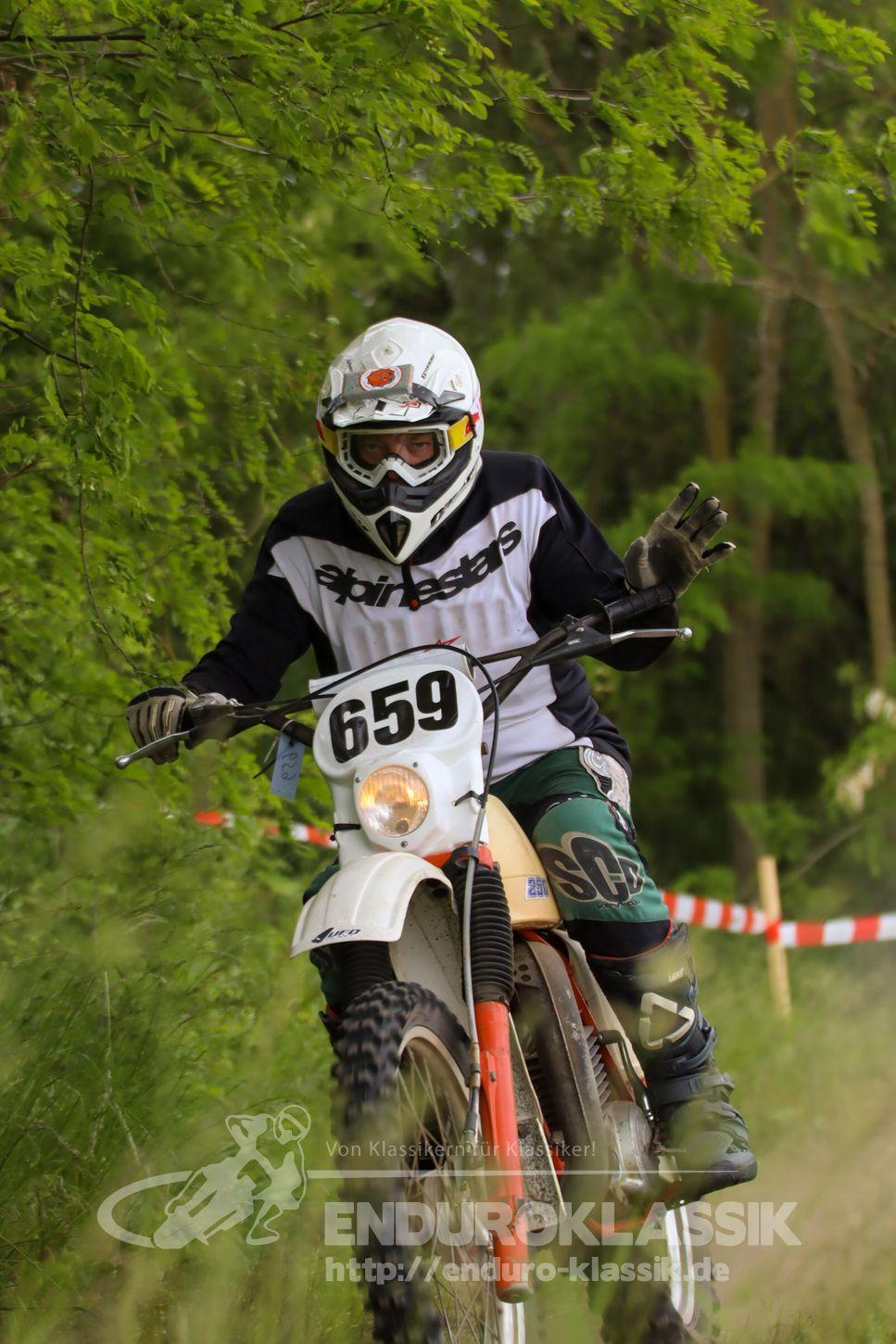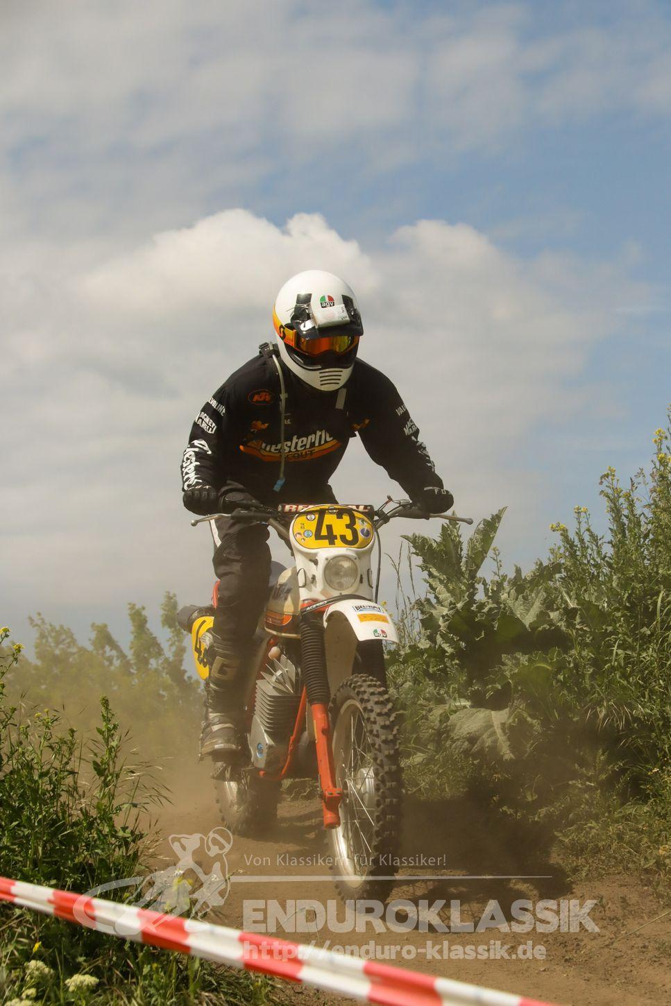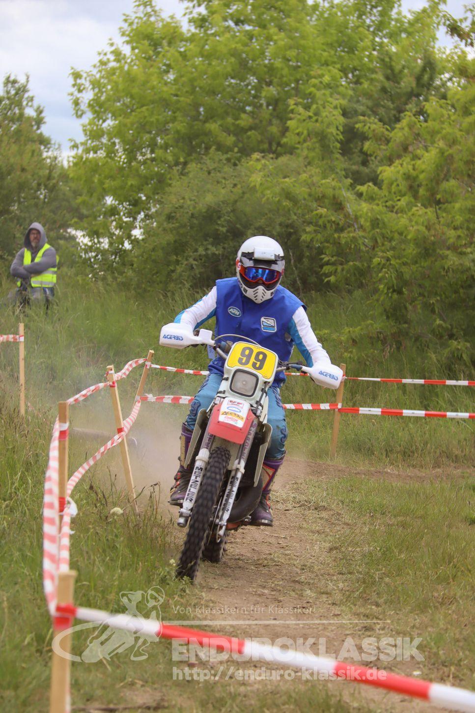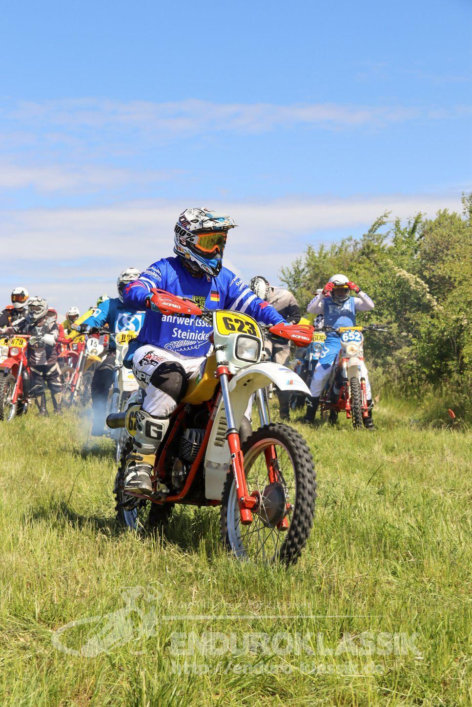 Bei bestem nordischen Wetter, viel Sonne bei einer frischen Brise, konnten mehr als 130 Teilnehmer am Samstag Vormittag ab 11 Uhr die Erste der geforderten 6 bzw. 7 Geländerunden in Angriff nehmen. Der Start erfolgte direkt neben dem neuen Fahrerlager, einer ausreichend großen, schön mit Kiessteinen befestigten Fläche, und unmittelbar angrenzend an das Hummelberg Enduro Gelände. Die von den Vorjahren bereits überwiegend bekannten Singletrails waren im Kernbereich des Waldes nochmals um einige Schleifen sowie sandige Auf- und Abfahrten erweitert worden. Das Befahren der Trails erforderte viel Geschick, gute Koordination und auch ordentlich Kondition, bei großzügig bemessenen Zeitvorgaben. Stehvermögen der Aktiven war zudem beim Absolvieren der Sonderprüfungen verlangt. Jede gefahrene Runde wurde gezeitet. Auf dem sandigen Geläuf mit Anliegern und Sprunghügeln wurden bei einer Fahrzeit von grob 4 bis 5 Minuten bei manchem zum Ende hin die Unterarme dann schon mal etwas dicker. Aber das tat insgesamt der Fahrfreude der Teilnehmer keinen Abbruch, auch wenn die Klassen mit den älteren Motorrädern, und somit mit den geringeren Federwegen, auf den besonders welligen Abschnitten mitunter schon so ihre Mühe hatten. Doch direkt nach dem Zieleinlauf konnte man sich am Imbiss mit bester Rostbratwurst oder Erbsensuppe schnell wieder stärken. Und bei der ganz zeitnah nach dem Zieleinlauf erfolgten Siegerehrung sah man dann durchwegs zufriedenes Grinsen, nach der staubigen und kräftezehrenden „Hummelberg-Intensivkur“. Gefallen hat, dass in den jeweiligen Klassen nicht nur die Plätze 1 – 3 mit schönen Plaketten ausgezeichnet wurden, sondern dass auch die Platzierungen 4 und 5 mitprämiert wurden. Eine schöne Geste, wie wir finden. Zum Auftakt in die 2025er Klassiksaison und zur persönlichen Fahrtechnik- und Konditionskontrolle war Schönebeck auf jeden Fall eine prima Sache. Den Jungs und Mädels vom MSC Schönebeck ist es gelungen, mit den vor Ort verfügbaren Gegebenheiten, für die Teilnehmer ein interessantes und wie beschrieben sehr intensives Endurosporterlebnis auf die Beine zu stellen.